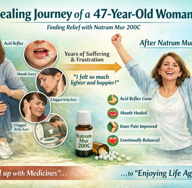 A 47-year-old woman presented with long-standing complaints including acid reflux, knee pain, fissures inside the cheeks, ear blockage with itching, motion sickness, and digestive intolerance to spicy food, but what stood out was not just the range of physical symptoms, it was her emotional narrative of feeling unfulfilled, unheard, and burdened since childhood, along with strain in her personal relationships and a constant sense of dissatisfaction with life; rather than approaching the case symptom by symptom, it was understood in totality, connecting her physical complaints with her deeper emotional state, and a constitutional remedy was prescribed, following which she reported within a month that her acid reflux had subsided even after dietary triggers, the cracks in her cheeks had healed, knee pain had reduced, and most importantly, she felt lighter, calmer, and emotionally more balanced, highlighting how meaningful recovery often begins when the individual is understood as a whole rather than treated in fragments.Blog post description.