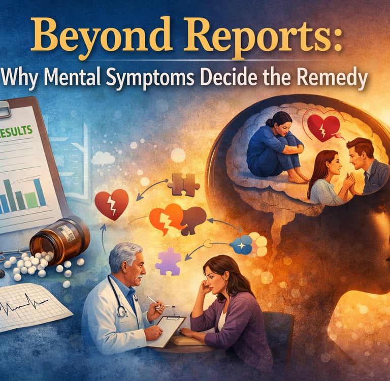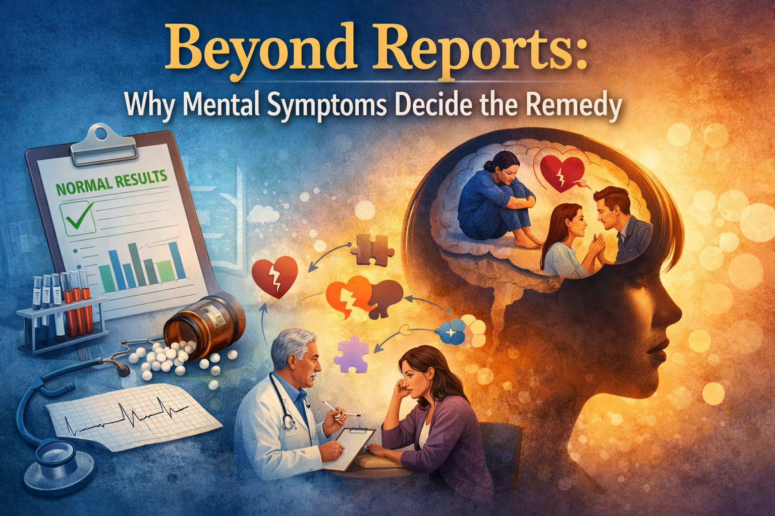 A patient may arrive with normal lab reports yet still feel unwell, and this is where homeopathic case taking shifts focus from reports to the person; mental and emotional patterns – how one reacts to stress, relationships, expectations, and life experiences – often reveal what physical symptoms alone cannot, making them central to selecting a true constitutional remedy. By carefully observing not just what the patient says but how they say it, along with changes in behavior, expressions, and life responses, a homeopath uncovers the deeper disturbance behind the illness. This approach, refined through decades of clinical experience, highlights that real healing begins when the individual is understood in totality, not reduced to isolated symptoms.